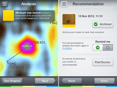 والتطبيق يسمي Skin Vision وحيث ان هذا التطبيق كان وراءه الكثير من الابحاث العلميه فقد وصل الي النهائيات في مسابقه INDEX Awords 2013 وقد شارك في تصميم هذا التطبيق الكثير من أطباء الجلد وطوروه بحيث يمكن لاي فرد استخدام الموبايل للكشف علي صحة جلده باستخدام الاشعه فوق البنفسجيه.