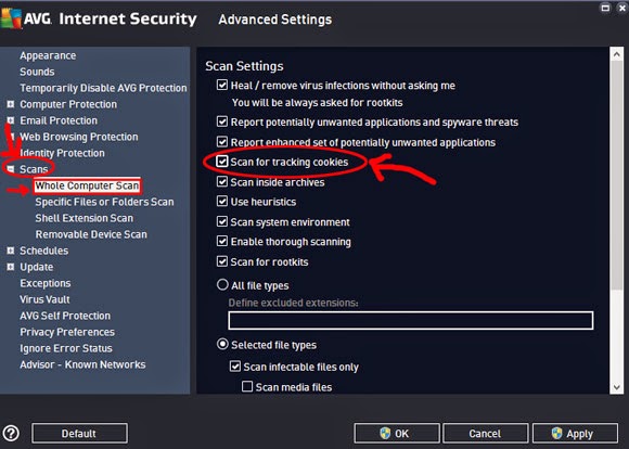 من قائمة scans اختار whole computer scan ثم تأكد ان تضع علامه صح بجوار scan for tracking cookies
