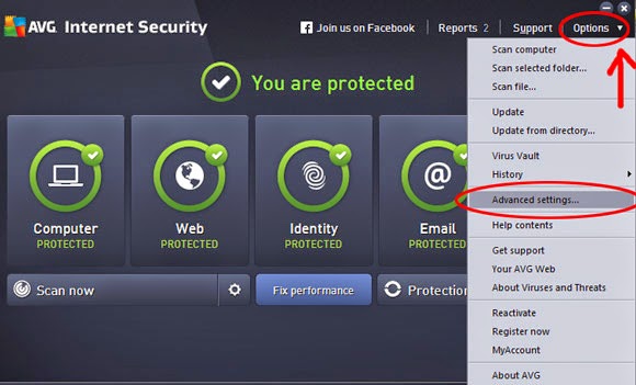 وهذه أهم خطوه علي الاطلاقافتح برنامج AVG internet security ثم قم بالضغط علي option ثم Advanced Settings