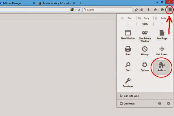 a- قم بالضغط علي زر القائمه في الاعلي اقصي اليمين واختار add-ons
