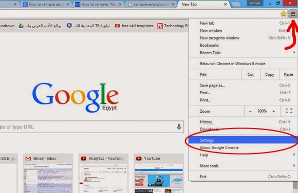 c- قم بعمل reset لمتصفح جوجل كروم من خلال الضغط علي زر القائمه أقصي اليمين في الاعلي ثم إختيار Settings