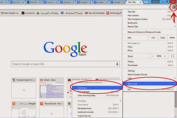بالنسبه لمتصفح جوجل كرومa- أضغط علي زر الاعدادت أقصي اليمين في الاعلي قم بإختيار more tools ثم إختار Extensions كما في الصوره