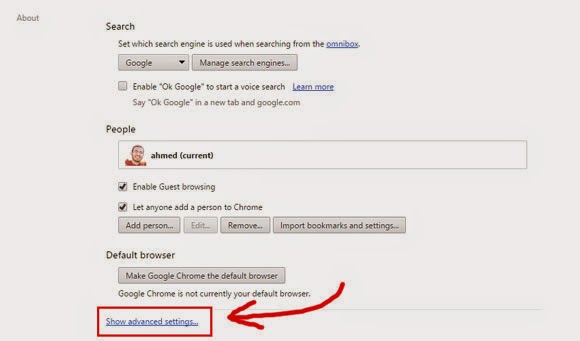d- ثم قم بالنزول الي اسفل الصفحه وقم بالضغط علي show advanced settings